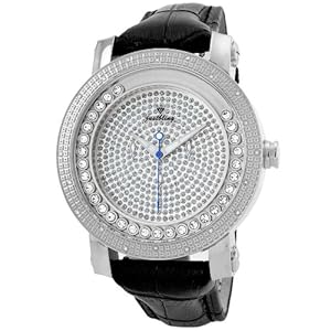 Glistening with exquisite rolling crystals on an embedded ring, this Just Bling men's 50-millimeter all stainless steel watch catches the eye starting with its round ornate diamond-encrusted bezel. A diamond shaped logo on the crown of the watch shows the finest details of the unique design of Just Bling’s collections. A 24-millimeter genuine crocodile pattern black leather band with a deployment clasp buckle is firmly fit to the case lugs to secure the watch to your wrist. The solid stainless steel look with moving stones, a decorated pave dial and a diamond encrusted bezel gives this timepiece an elegant and luxury aspect. The inner dial is embellished with crystal accents featuring 3 decorative stainless steel hands as well as an eye-catching Just Bling signature contrast blue second hand. This watch is water resistant up to 5 ATM (50Meters/165 feet).